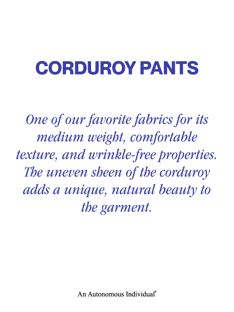 Carefully crafted from 2 different sizes(wales) of corduroy fabric. A 4 patched pockets pants with an oversized silhouette providing comfort and style all day. Durable and wrinkle free, keep yourself looking fresh while traveling or after a full day of activities.
